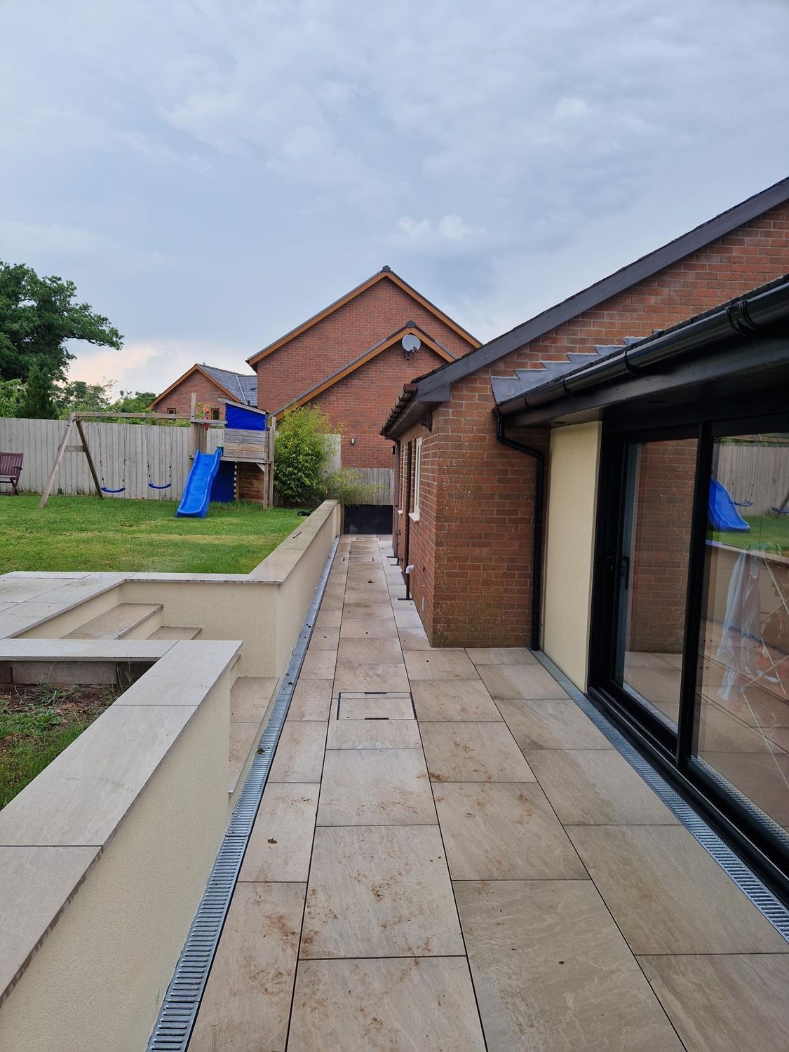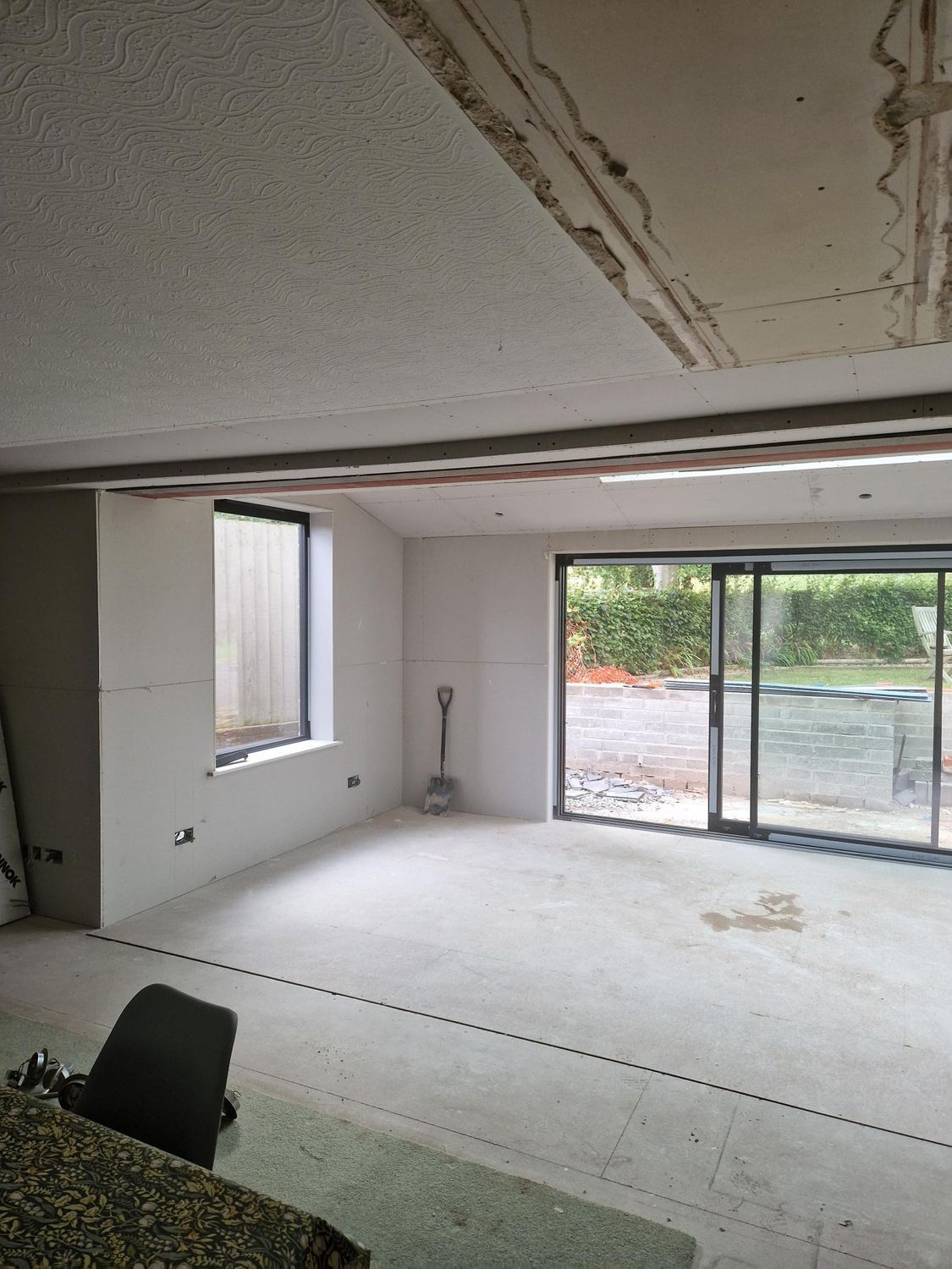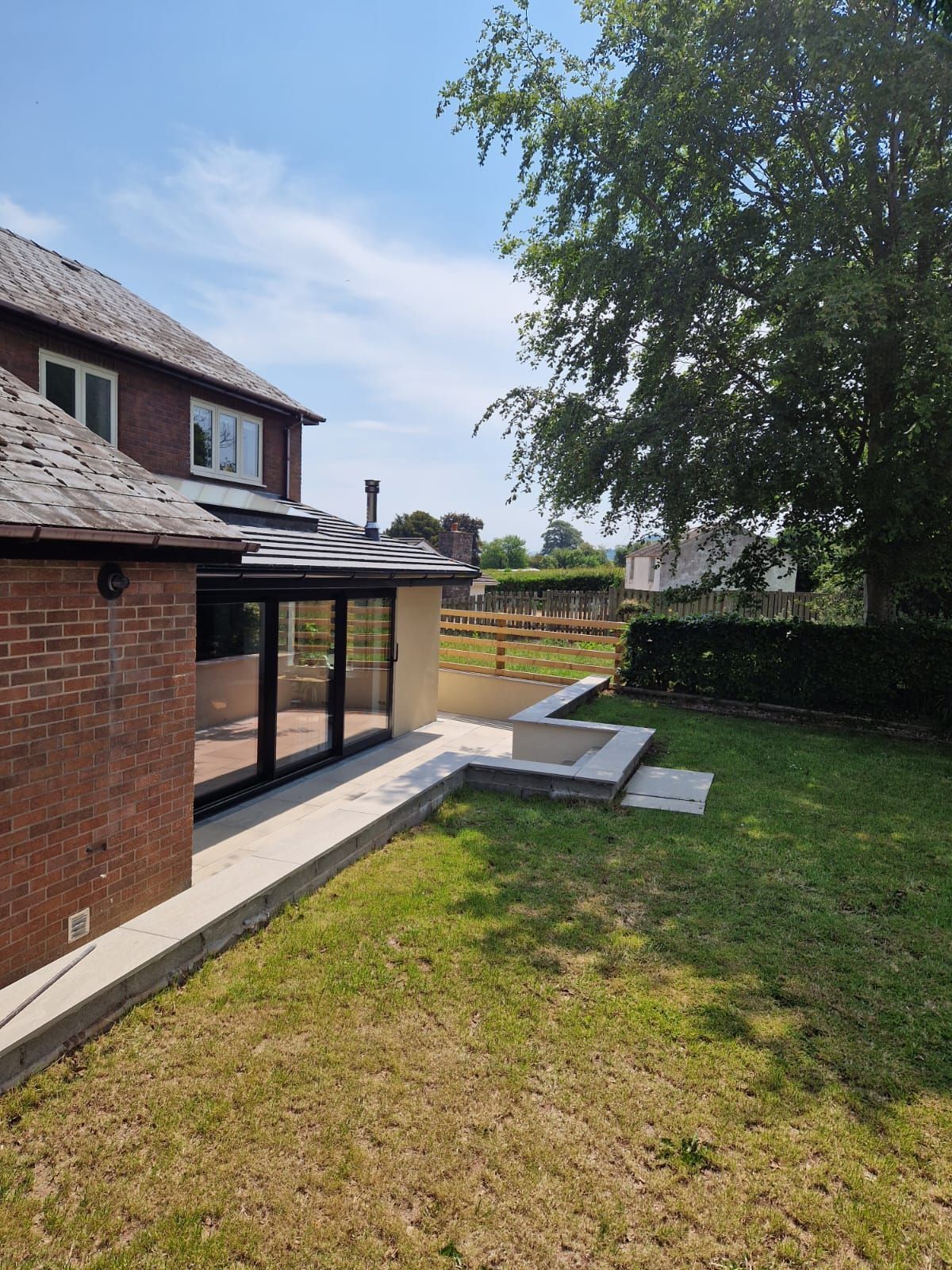 The extension features a huge rooflight that floods the space with natural light, along with sleek aluminium windows and sliding doors. We handled all the groundwork and drainage, using traditional construction techniques, and finished the outdoor area with beautiful porcelain slabbing. It's now a wonderfully bright and functional heart of the home.